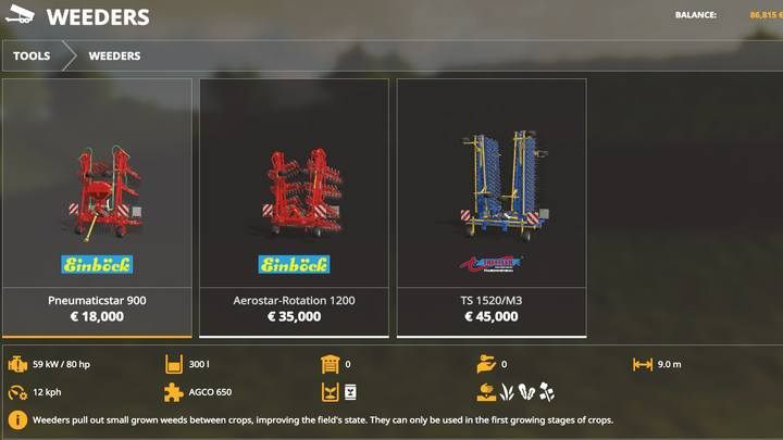 In the Farming Simulator 19, there are new obstacles to cultivation - weeds. Use weeders to pull them out of the ground when the plants have not yet grown to harvest. This is a simple mechanical method - spraying is an alternative, but you have to pay for it. If the crop destruction option is active, equip the tractor with narrow wheels in order not to damage the plants during weed control.