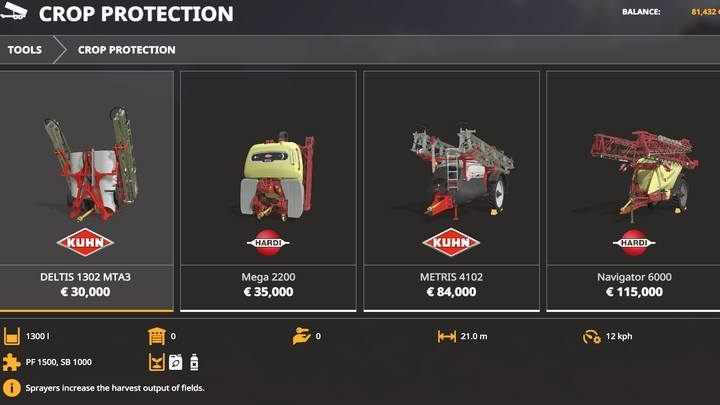 You can use several KUHN and HARDI machines to fertilize and protect your crops. Each of them works over a very large area, and cheaper models can be mounted on the tractor at the front or rear, and the most expensive models (apart from the much larger area of operation, of course) are connected as trailers. Each machine can be filled with liquid fertilizer from the shop, or with weed killers that get rid of the weeds on the field.