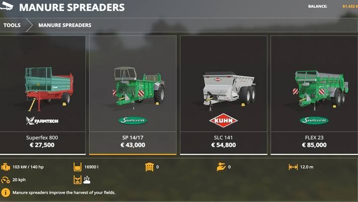 Fertilizing a field with manure is not such a simple matter. You will get manure from cow and pig farms if you deliver straw to the animals. Fertilizer spreaders must be manually recharged (using a spade). The trailers have their own fertilizer spreader mechanism.