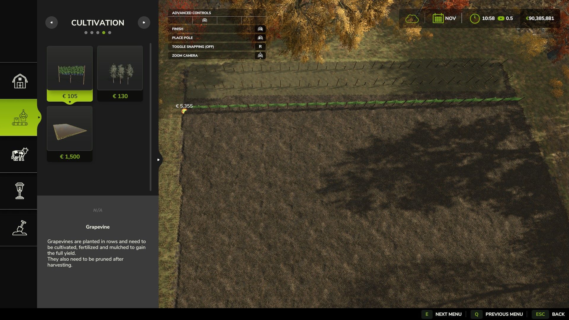 - TPN 140 mulcher - after placing the posts or trees, you'll have to wait at least a month. Once grass grows between the rows, you will need to mulch. The only suitable mulcher in the basic version of the game is the TPN 140: it is the only one narrow enough to fit between the rows. You will find it in the store, in the grape tools section.