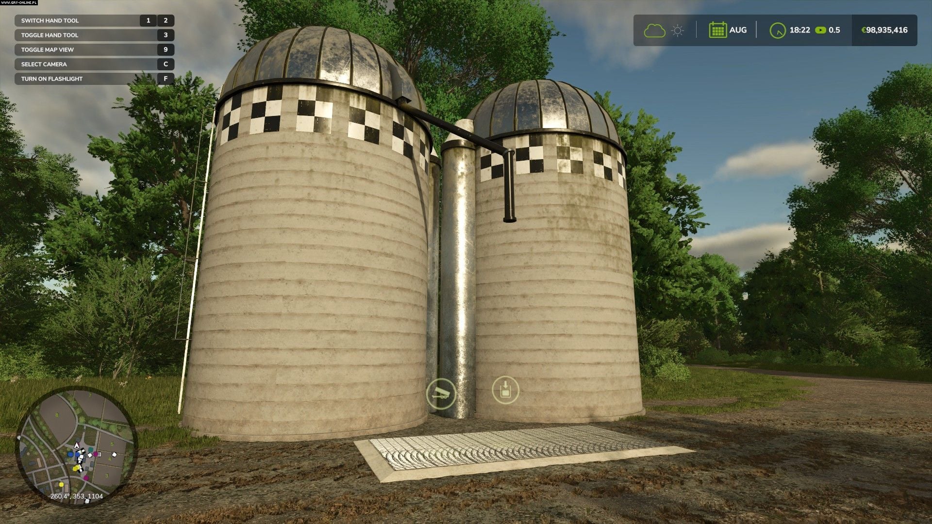 - Silos - the most basic and most universal place for storing crops. You will find the basic grain silo on your farm. You can also place additional silos through the building menu. In the Silos tab you will also find buildings for storing slurry and other products. These buildings work similarly to silos. There are also public silos out there. Silos allow you to either fill the silo by dumping the crops from the vehicle or to empty the silo into a trailer positioned under the pipe.