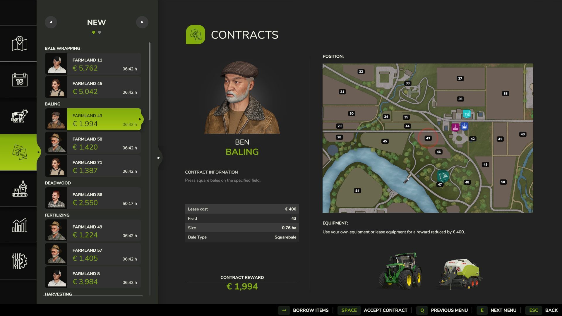 In the pause menu, you will find a tab described as Agricultural services. If you currently have some free time, you can do some contracts. It's a quick and easy way to earn money, as well as an opportunity to test new mechanics. If you do not have the necessary equipment, you can rent the machines for a small fee.