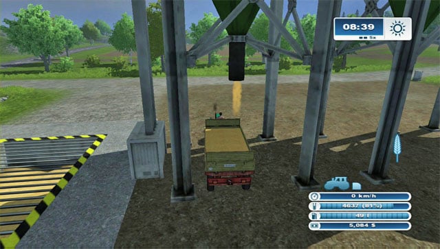 Field number 16 should be already harvested. Always remember to take the machine which has finished its work (in this case the harvester) away from the field so that it doesn't stand in the way of other works (cultivation). The trailer is surely not full. Head to the silos fill it up with wheat. Be careful to drive to the right one - the icons show what's inside each of them (from the left: wheat, barley, rape, corn).