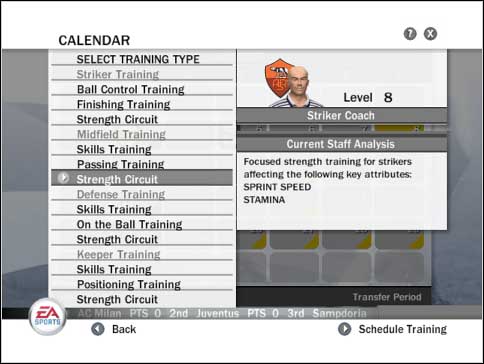 A new window appears. Training is divided into formations. More than one session is available for all the positions. Main differences are: Finishing Training for attackers, Passing Training for midfielders, On The Ball Training for defenders and Positioning Training for goalkeepers. If you look for development, change sessions every week. Various schedules are the key to skill growth. Watch for coach abilities. Don't use Goalkeeper Coach in strikers training.
