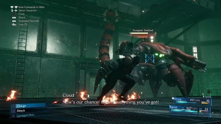 After planting the bomb, you will have to fight the first boss of FF7 Remake - Scorpion Sentinel. Remember, however, that the bomb isn't activated yet. You can easily test the characters skills and get used to the combat system.