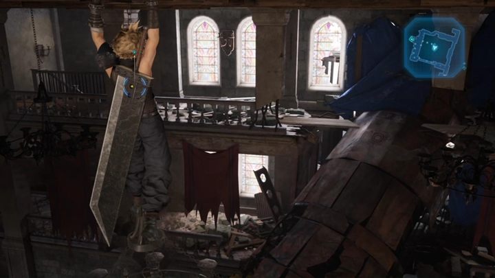 Time to get out of the church. Follow Aerith - you can't reach the room at the bottom of the church, which is blocked by the Spectres. You will be able to get there later. For now, focus on following your companion. At one point, the woman will fall down - approach the ledge without a railing, and Cloud will grab the wooden beams. Go to the chandelier and knock it down. Then join Aerith and follow her.