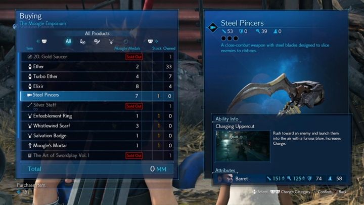 Along the way, you'll come across a Pedometer Materia. It's worth equipping it on one of the characters - as the time progresses, it will change into AP UP Materia. You'll reach a new area - after the cut-scene you will unlock many side missions and a lot of terrain to explore. The walkthroughs for side quests can be found in the separate chapters of the guide. It is recommended to visit e.g. The Moogle Emporium to buy new items for party members, including Steel Pincers - a weapon for Barret. A vendor near Corneo's house offers a new weapon for Cloud - Mythril Saber. Finally, it is also worth visiting the Corneo Colloseum, because it offers completely new challenges.