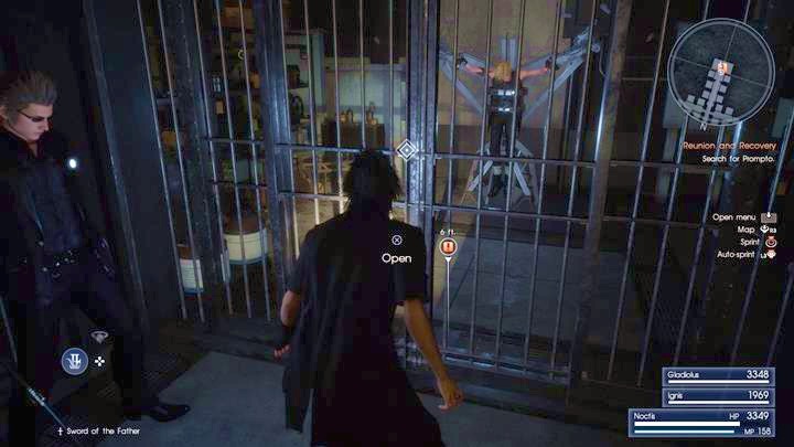 Run to the room with the screens and press the button to unlock the passage. Run along it until you reach a cell with Prompto. The team will once again be complete. Head to the elevator and locate the device that disrupts Noctis' power. Destroy the generator and the prince will regain his power. You can finally access all of your weapons - equip the ones you like to fight with the most.