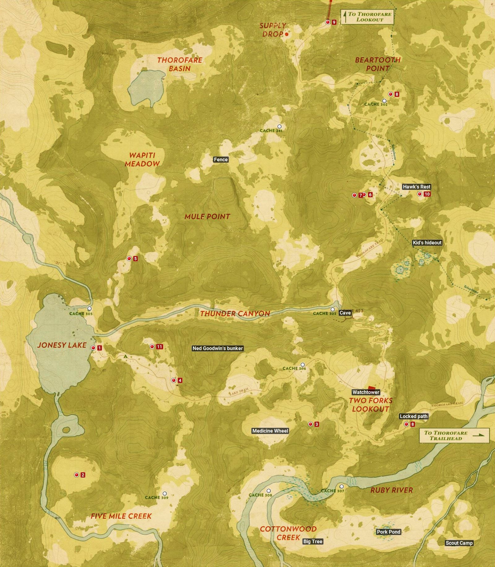 The map in Firewatch presents the entire area available to Henry. This is the same map that you use in the game. Additionally, tour map is updated by the paths that you can copy from other maps that you find in supply caches. The map presents key locations connected with missions and optional exploration. Apart from that, the map provides names of landmarks which you can travel to - they are marked on the in-game map only after you come sufficiently close to them.