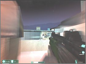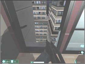 You might also lean out and kill one or two from the roof below. All enemies carry G2A2 Assault Rifles. Go down to the lower roof, go straight on, then right - up the stairs, and then get to the double door.