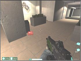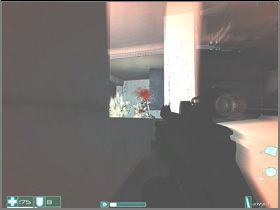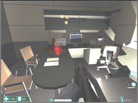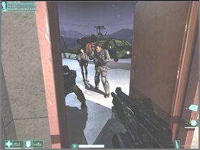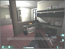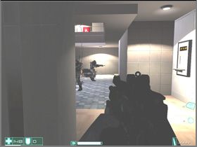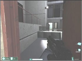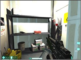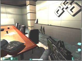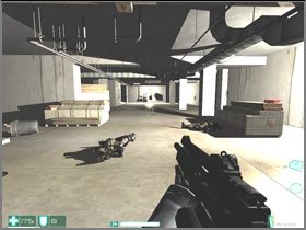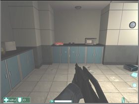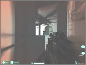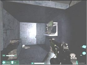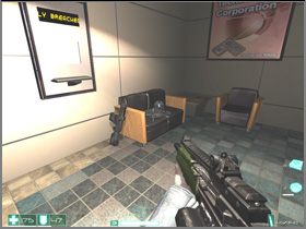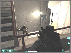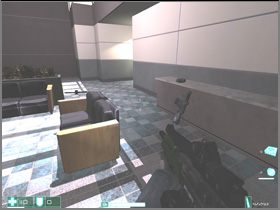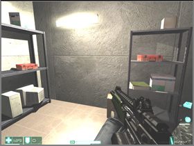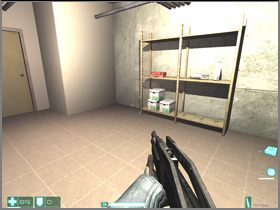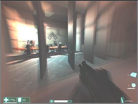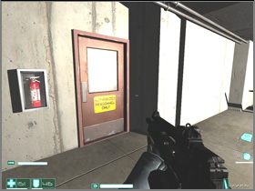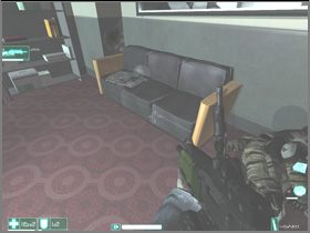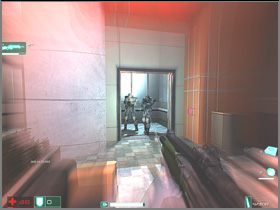 Return to the corridor and keep going further. Stop as soon as you see the horizontally opened blinds on the left. There's been a trap set for you here (the picture on the left above). That's why, throw one or two proximity mines under the blinds and one in the corridor. Move closer to the blinds and when they open - run away. The explosion should kill some of the four enemies, finish the rest off. Gather their weapons - two RPL Sub-Machineguns, a G2A2 Assault Rifle and a VK-12 Combat Shotgun.