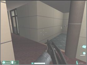 Inside the room you'll find a Medkit on a metal shelf. Open the door and enter the large office room. Go straight on. Once you get to the fork, depicted in the picture on the right above, turn right. You'll find a Health Booster on a sofa.