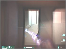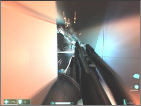 New enemies will appear in here - the robots shaped like the letter "Y" flying and shooting with laser (their weapon is not dangerous but it's very fast so you must be careful anyway). The method to eliminate them is simple - attack using a shotgun once you're near them, and use the particle weapon when you're far from them - in both cases, use Slo-Mo, two shoots should be enough to destroy the robots. Defeat the robots and enter the hall on the left.