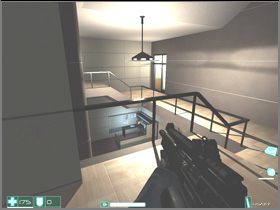 Go right, there'll be an AT-14 Pistol lying on a table. After taking it, wait until three soldiers go downstairs using the ropes - try to kill two of them at once (Slo-Mo, a rifle and shots at the head). Then, hide and wait for the Slo-Mo to reload, and attack the last soldier. Gather the enemies' weapons - two G2A2 Assault Rifles and an RPL Sub-Machinegun. Look out - when you approach the stairs, two flying robots will run inside through the window. You should know how to handle them by now.