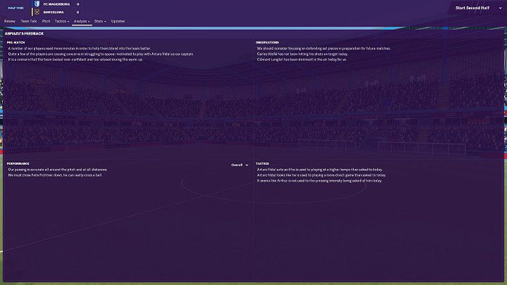 The assistant plays an invaluable role during a match and will always provide you with detailed reports about the current situation, as well as propose some changes. Pay special attention to the messages that are displayed during the match. The assistant will only suggest certain changes if something on the field doesn't work as it should. For example, you can get a hint about the poor disposition of one of the players, which will require a substitution. Another example is the situation when your players notoriously lose the fight for the high balls and you have to change something in the team's play style, so that they exchange more passes close to the ground.