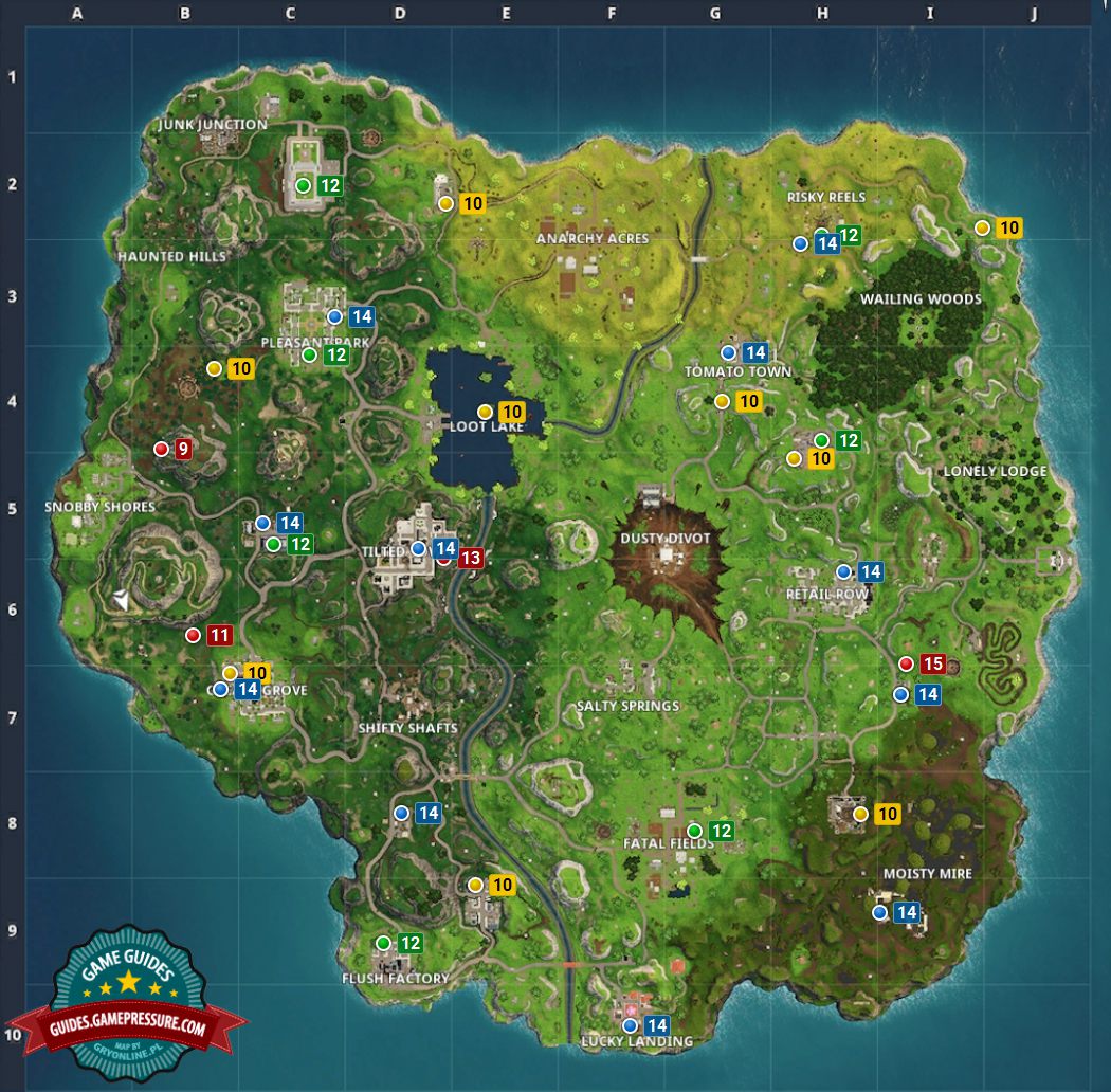 Season 4, weeks 5 to 8 challenges in Fortnite Battle Royale. Above you can find a map with challenges markings.
