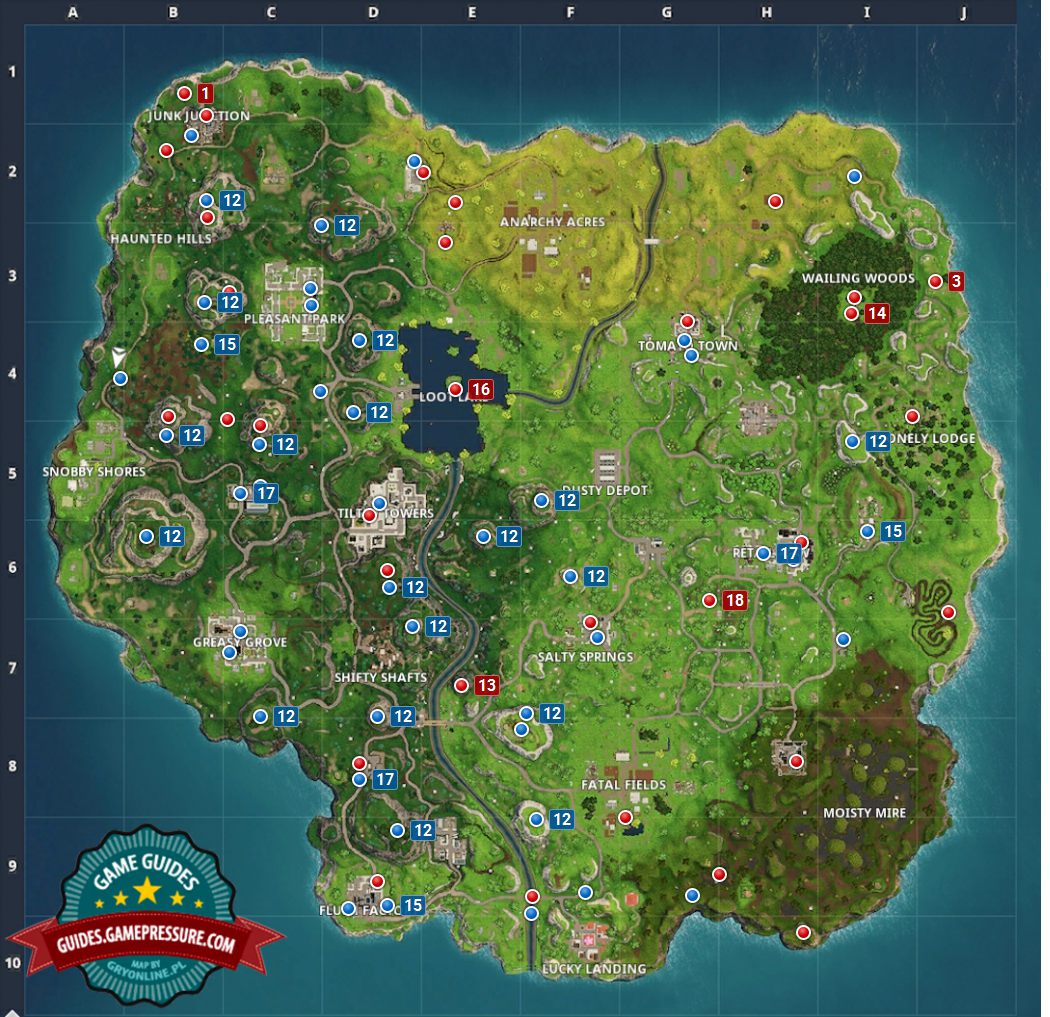 In season three in Fortnite Battle Royale, just like in the previous one, players can spend 950 vbucks to unlock as many as a hundred of levels that reward them with various gifts. Among them, there are several interesting skins and each successive level requires you to collect ten stars. Fortunately, you do not have to worry about time, while obtaining all those rewards. Epic Games have implemented in this season the so called weekly challenges. As the name suggests, every week, you will receive a number of challenges, each of which reward you with 50 stars. This means that each week will provide you with five levels of the Battle Pass. Unlike in the case of season 2, these challenges do are not lost so, even if you decide to buy a pass, you will still be able to complete the challenges of the first season even after the second season has started. Below, all of the challenges of the initial weeks of the first season have been listed, alongside with the map, thanks to which you will find secret spots without any problems.