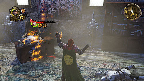 In this room bigger but not challenging battle takes place. Find a man in purple robe among the attackers.