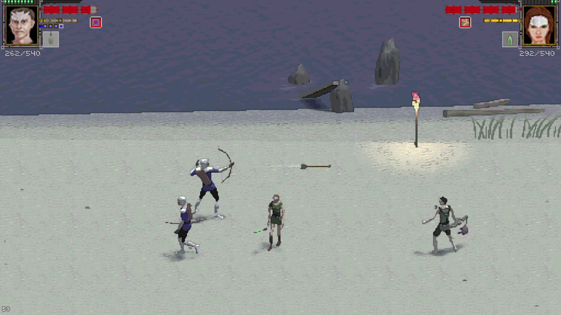 We explore the open-structured map and the events are presented from a bird's eye view. The driving force of the game are quests that push the plot forward, which we receive from friendly independent characters. Upon reaching a certain location, the camera changes perspective to a side view.