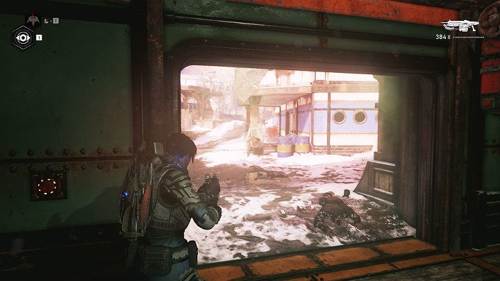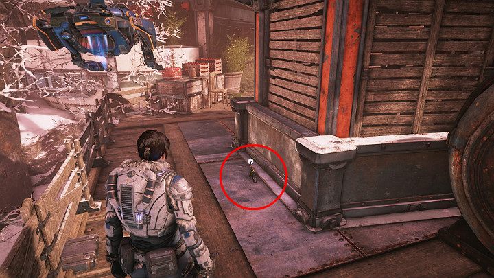 The next collectible is in the snow behind a big, fancy horn - GEAR's lost helmet. Go through the security gate and continue moving towards the steam farm.