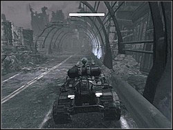 You're inside a building, but it isn't in the best of shapes so stay in the light. When Wretches attack you , bring out your shotgun. After you get out of the building, turn right and pick up 18.Tag. On the backseat of a nearby car you can see a propane tank - shoot it, get close and keep your pace with the sliding car wreck. You'll find some ammo in the back of the gas station. What you need to do is to tank your APC (using the handle). Locusts prepared an ambush here, so stay on your toes. When a Boomer appears, get into the building and finish him off from there. Also, watch out for the Wretches. One more tip: do not shoot the gas tanks - hiding behind them isn't such a good idea either. It's a gas station after all and it isn't hard to blow it all up. | ![]() |