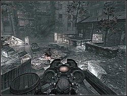 This fight seems hard only at a first glance. Try to use the Troika turret (on the far right) for the most part. You'll find a sniper gun in the building, but don't shoot hiding enemy snipers - you'll need it later. At the end of the fight a crater appears and three Boomers with it. You can finish them off with well aimed sniper shots to the head...or you can blow them up shooting the propane tanks below. | ![]() |
