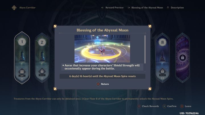 Spiral Abyss is a special dungeon that the player unlocks upon gaining 20 Adventure Rank (AR). This Dungeon changes every month - mostly prizes and opponents change. Spiral Abyss is divided into 8 rooms, and there are 3 chambers in each of them, so to complete each Spiral Abyss you need to complete as many as 24 chambers. You get rewards for completing each of them. Depending on the time in which you complete the room, you will receive 0-3 stars. After receiving 3 stars, you will be given the opportunity to receive a special award, which includes Primogems. To advance to the next room, you must earn at least six out of nine possible stars. After clearing room 8, you unlock Abyssal Moon Spire.