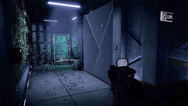 Soon, you will reach Future Defence Group HQ. You won't have to repeat the puzzle with the electronic lock because the game will allow you to go inside right away. You will end up in an underground garage which you should be familiar with. You will face some new opponents, and due to the size of the area, you need to watch out if you don't want to raise the alarm. Your target is the lift presented in the screenshot. There is an engram. Watch the cut scene and use the lift.