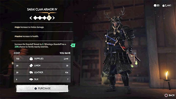 4 attacks are still not enough, but the Sakai Clan Armor can be upgraded. Purchase all the upgrades to enhance it to the maximum level. By doing so, it will offer a bonus of 2 additional attacks in one standoff.