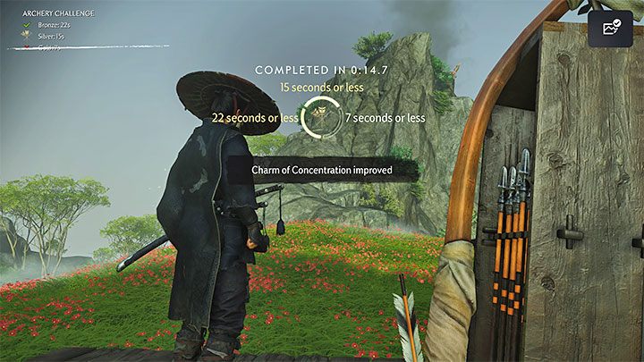 Every time you pass an archery challenge or obtain a better medal in an already-passed challenge, the charm gets stronger, letting you slow down time for longer. This is the way to obtain better results - keep improving your scores and initially focus on obtaining silver medals in all eight challenges.
