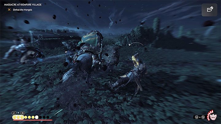 The horse charge ability is a great way to initiate fights - make sure to aim at the group of Mongols and then press the L1 button to charge at them at high speed. There is a good chance that some of them will die immediately or take significant damage.