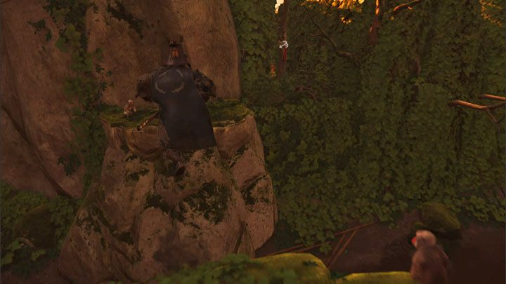 Go as far as possible to the right, where you can lower yourself on a rock ledge. Explore the obscured left area - the main character can walk on a rope here, and then on a downed tree.