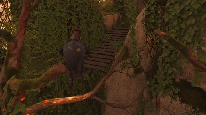 A little further you need to jump on another branch. You will have to jump two more times (the last jump is made towards the boards shown in the picture) and before each jump, turn the camera to the right.