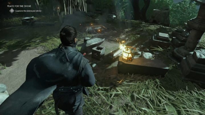 You start this quest by examining the location. A dead fox lies near the destroyed shrine. Examine all the damage.