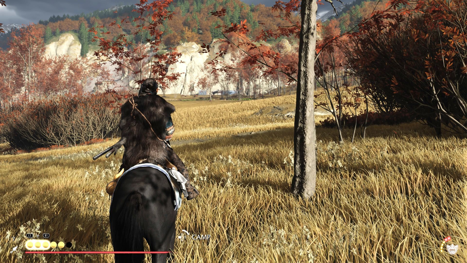 - Ride or approach your horse, hold left on the D-pad, and fill the camp bar that appears at the bottom of the screen.
