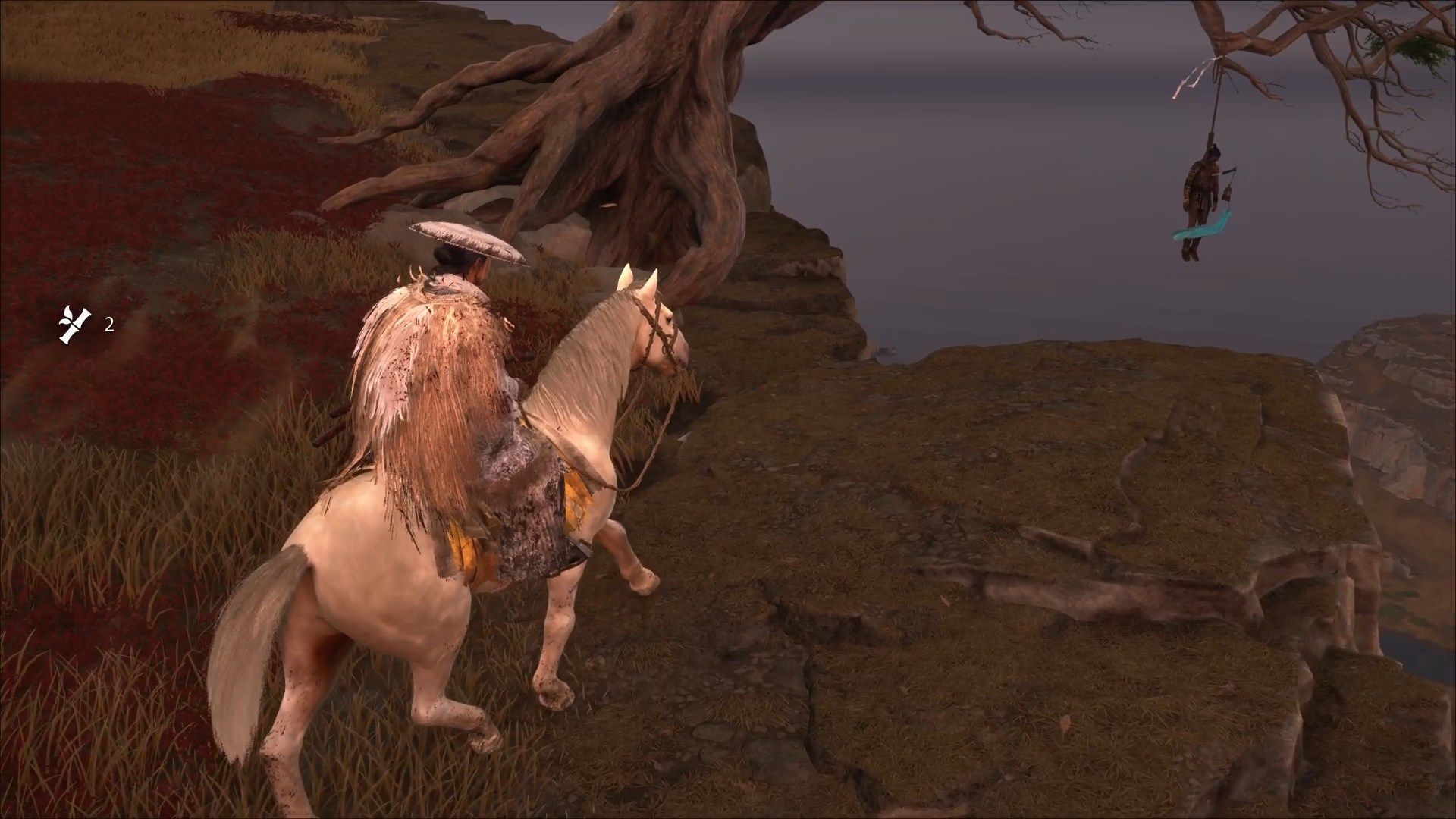 Following the last wind chime, you will reach a cliff on the western edge of the Ishikari Lowland. The further route is indicated by black samurai masks hanging on the walls and spears stuck in the ground. Follow their trail into the cave beneath the cliff. Inside the cave, you will have to jump on platforms and use the grappling hook to pull yourself towards branches.
