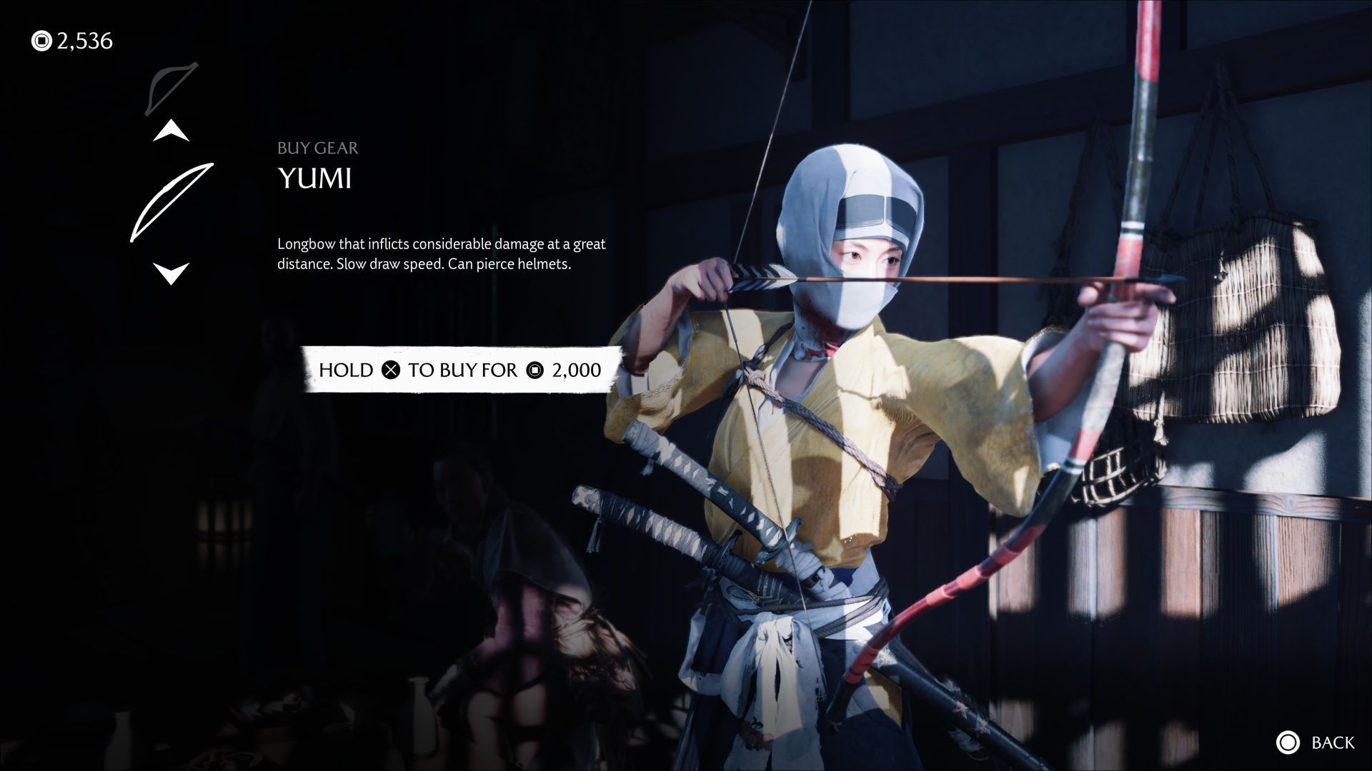 - The most important purchase in the early game is buying 2 bows – we've covered this topic in more detail on the How to get a bow? page. As a reminder, you need to meet Ran the Bowyer, and you'll first encounter her at the Yotei's Shadow Inn in the first region of the world.