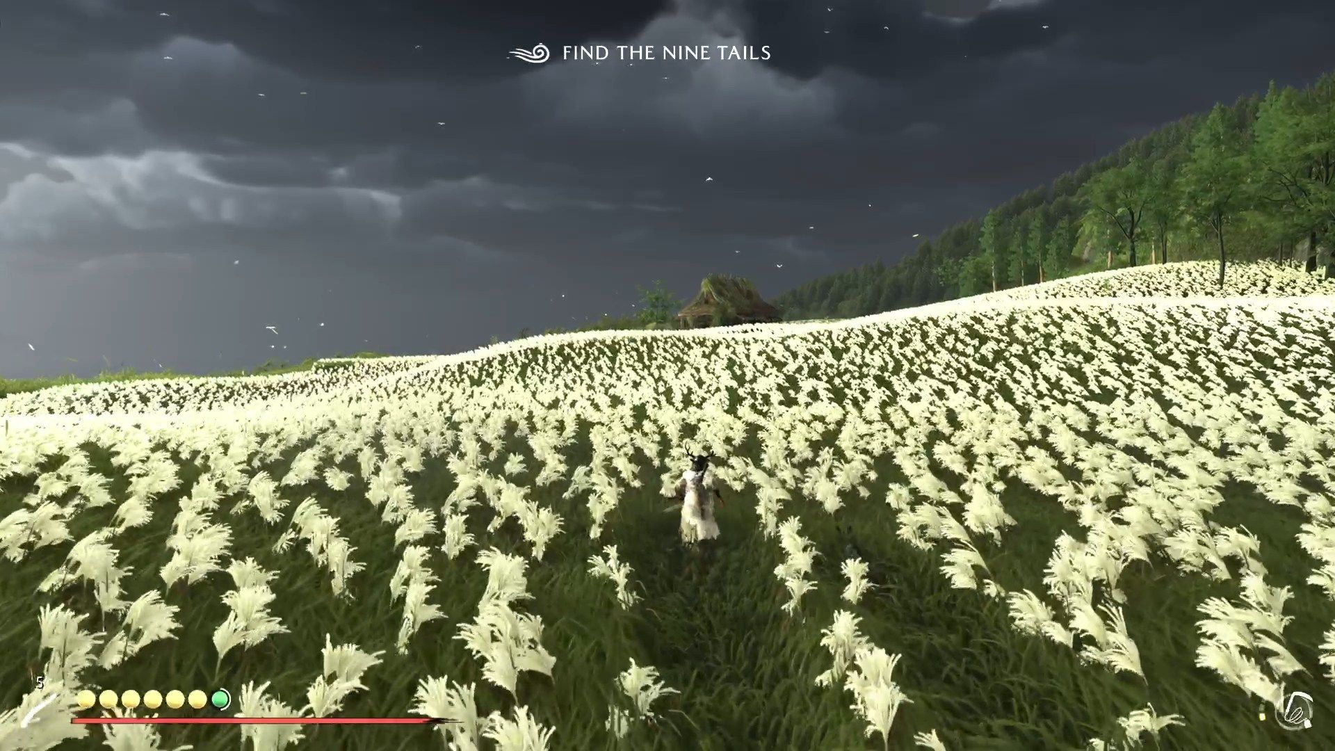 Climbing to the top of the waterfall will lead you to a cave where you will find Jin's sword, the titular Storm Blade. The sword will be stolen by a group of shinobi, and you will have to pursue their leader. During the chase, you will fall into a river and have to swim with the current until you reach a cliff you can climb. Eventually, you will reach a vast field of white grass. In the center stands Jin's house, which you can explore to learn about his life in Ezo.