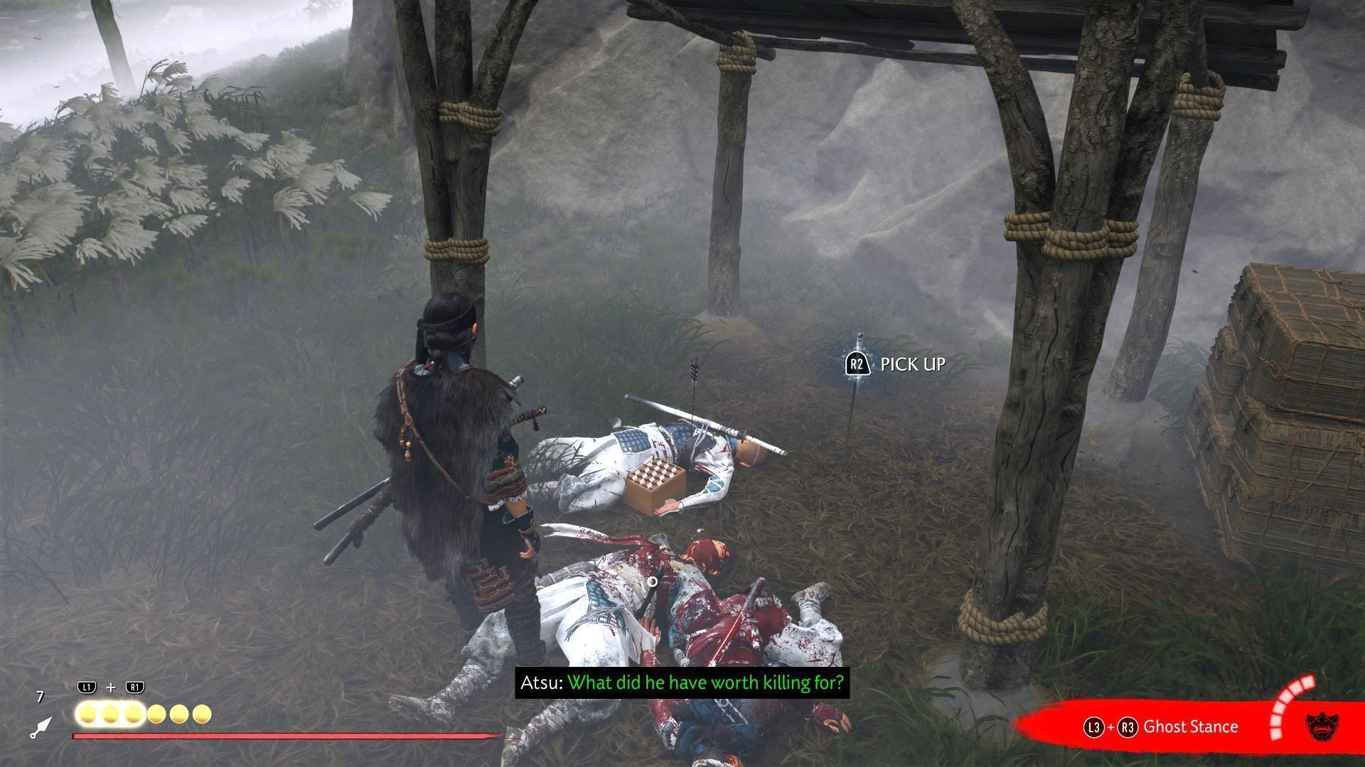 - Charm of the Wary Opponent - It can help you when sneaking by pressing L2 to quickly turn towards the opponent who has noticed Atsu. This will allow you to quickly take them out before the alarm is raised.