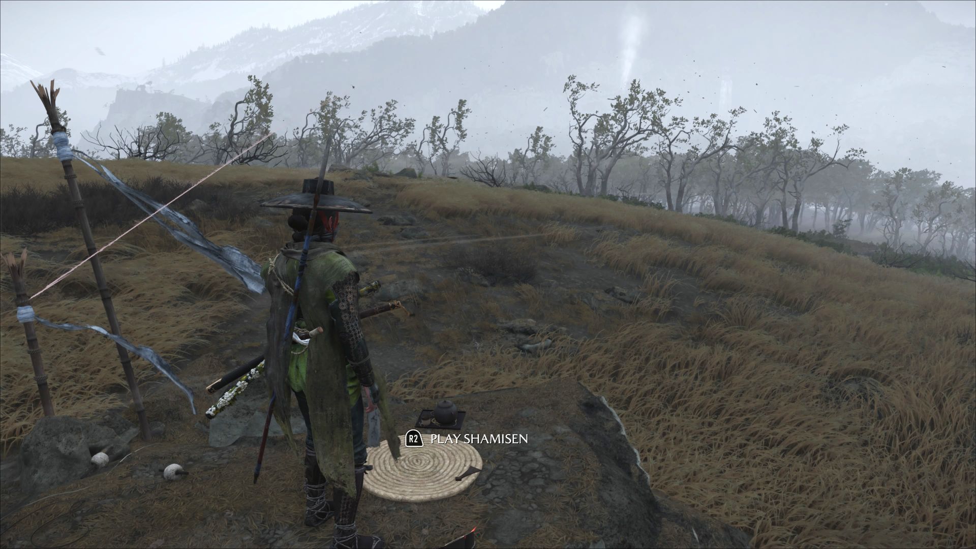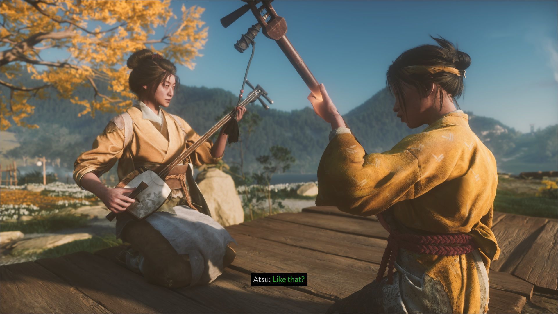 - Visit the Shamisen Practice site in the central part of the Teshio Ridge region. Here, you can play the shamisen alone, and Atsu will compose a new song.