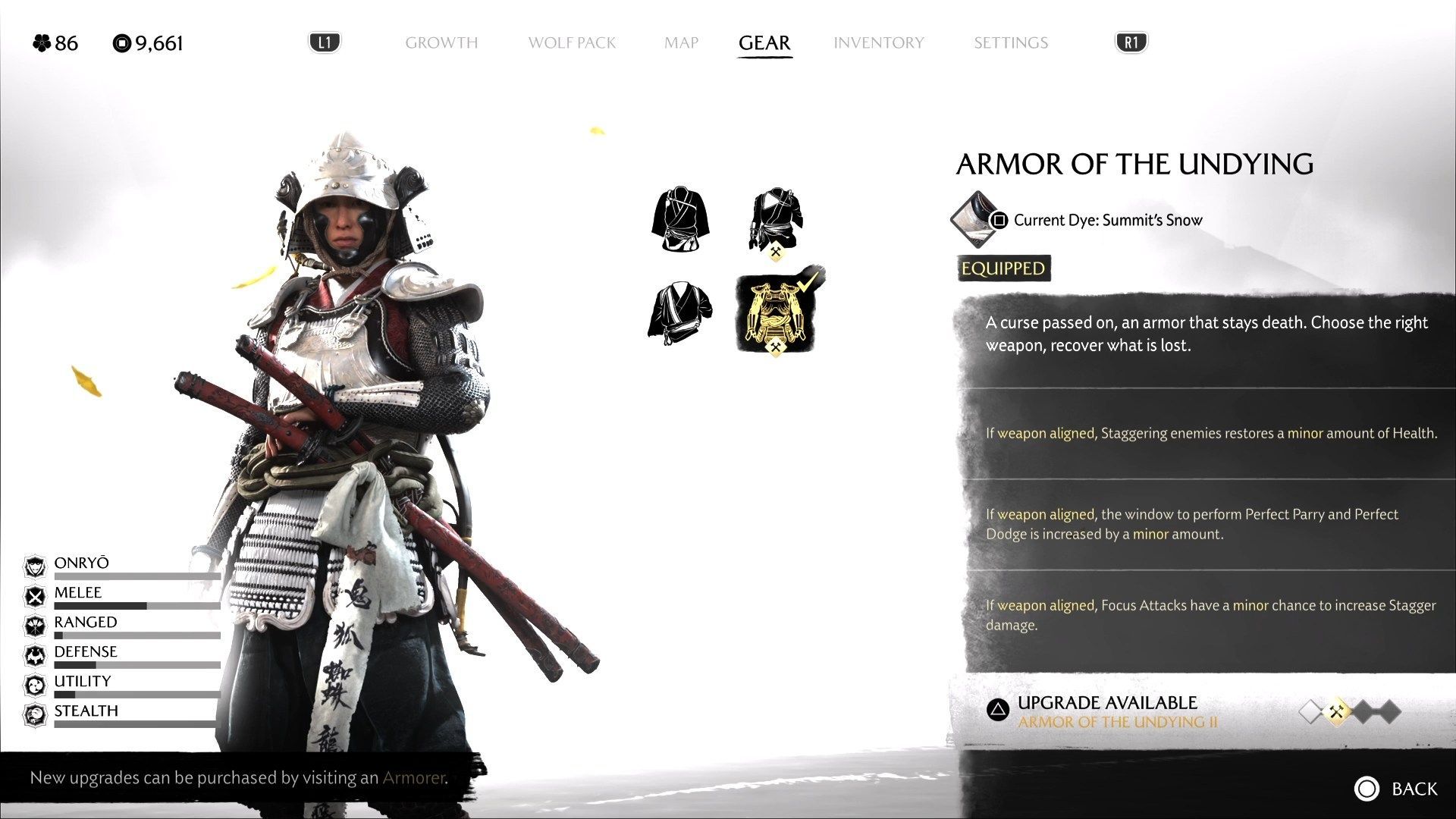 The effects of the Armor of the Undying are exceptionally useful, as it significantly increases both your defensive and offensive potential. When you wear this armor, you can heal by staggering enemies, your focused attacks charge the Stagger meter faster, and performing Perfect Parries and Perfect Dodges is much easier. These effects make you nearly unstoppable, but there's one catch - they only work when you're using the right weapon.