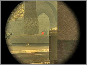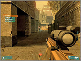 Keep moving forward. You will be encountering additional enemy units along the way. The terrorists may be hiding. Some of them will also appear on your right (#1). Furthermore, you will have to eliminate a sniper. He is hiding on a roof. It would be best to use the tactical view in order to locating him. It should be one of the buildings on your left (#2).