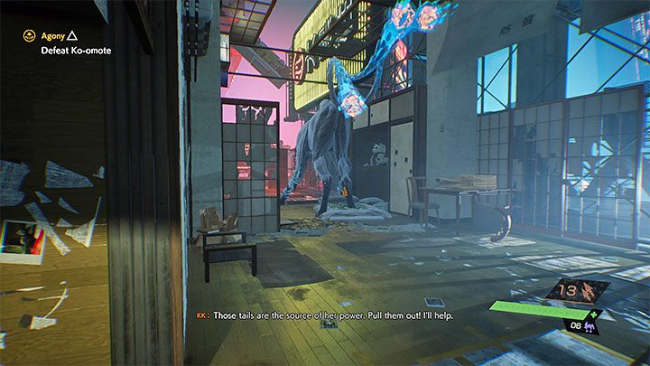 The key to winning this fight is to sneak up on the boss from behind while it's patrolling the area to perform Quick Purge - you need to use it on Ko-omote's tails. Each stealth attack will tear out that tail.