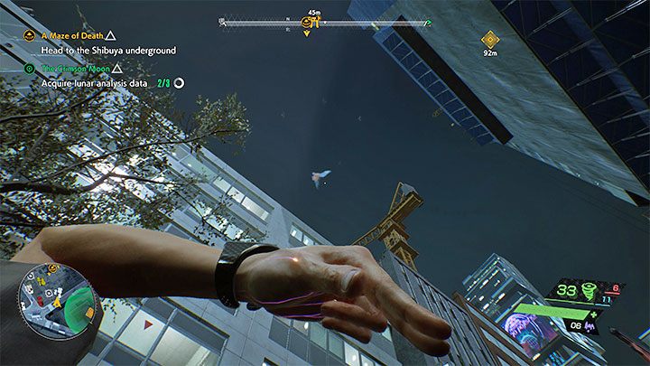 Locate the tengu pictured above - it's flying over the building adjacent to the quest objective. It can be recognized by the large, yellow crane from the construction site. Latch onto the tengu to land on the roof.