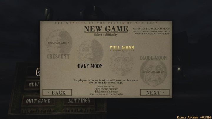 Gloomwood will ultimately offer 4 levels of difficulty - Crescent, Half Moon, Full Moon and Blood Moon. Unfortunately , only the 2 middle tiers are available in the Early Access version (September '22) . The other two are to be added in the future.