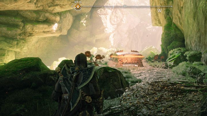 Unlocking this secret requires you to have the Draupnir Spear (the weapon obtained in the course of the main storyline) Start from the central part of the camp and follow the path northwest. In the area from the screenshot, you can throw the spear at an opening.