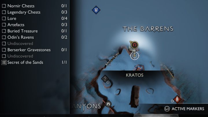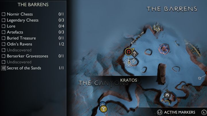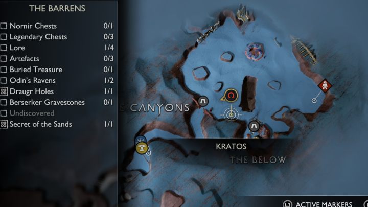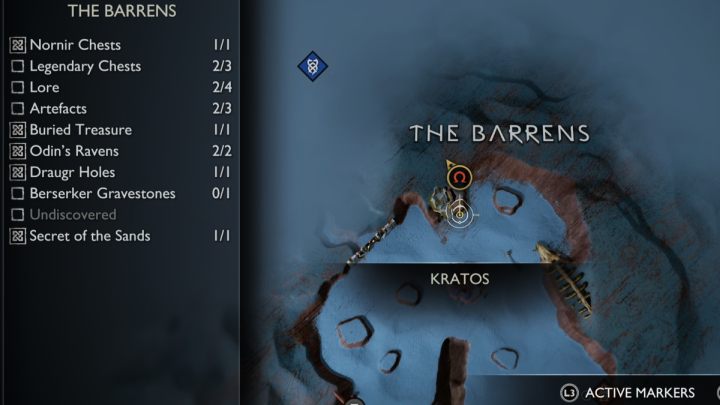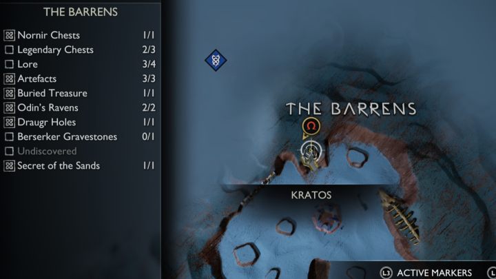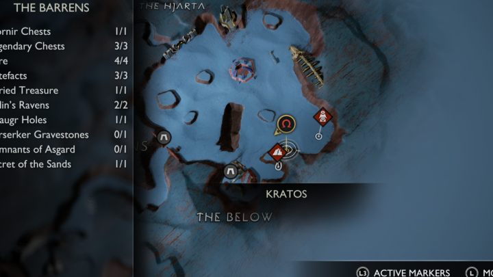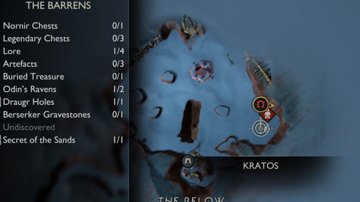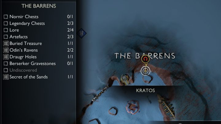 On this page you can find the list and exact locations of all collectibles appearing in The Barrens region of Alfheim, among them, Legendary Chests, Nornir Chests, Odin's Ravens, Lore items, Artifacts, Draugr Holes, and Remnants of Asgard.