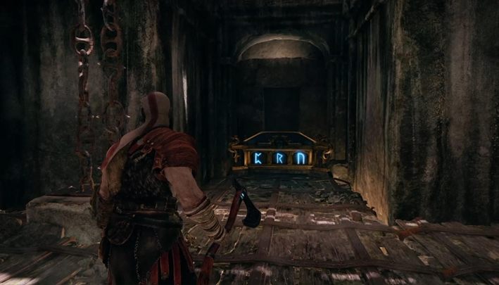 Commentary: First you must reveal the runes on the ceiling. Then throw Atreus up and finally move him and the board cargo towards the bowl with sand.