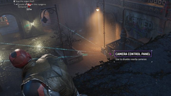 To continue the main storyline, you have to stop two of the Penguin's dealings marked in yellow in the northern part of the city. You'll have to stay hidden during the organ trafficking deal. Watch out for the cameras and scan the area to find the off switch before you start your infiltration. If you're ever detected, you'll have two minutes to get the container and deliver it to the designated location.