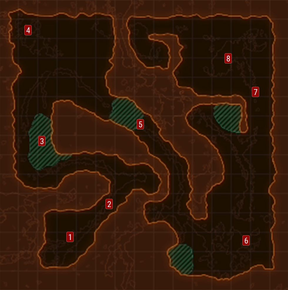 Gather your army and take the only passage to the North [2]. In the bushes [3], you may encounter a small group of opponents. They are not too strong, but they may decimate your forces, by attacking by surprise. From there, go north, towards the corner of the map. Eliminate the single enemy units. In the marked area [4], build a Small Hub and destroy the Catalyst Vent Plug blocking your access to the resources. To the Small Hub, attach a refinery and a Small Factory.